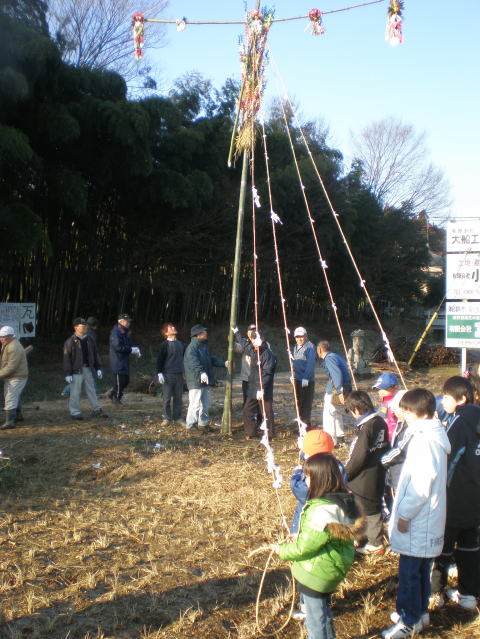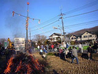 ![]() 綱を引いて倒します。皆で。手前は移動して火をつけた塚。 |