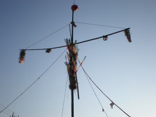 ![]() 大きな弓。地面に向けて射掛けているのは田畑の悪い虫を退治するという意味だそう。 |