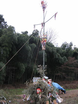 ![]() 立派な塚には大きな弓矢。 地面に向けて射掛けているのは田畑の悪い虫を退治するという意味。 |