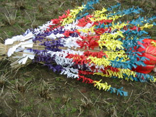 ![]() 竹を細く割ったものに和紙を順番に巻きつけたヤナギ。 色紙は巻く順番も決められており意味もあるんだそう。 どんど焼きに来た人はこれを持ち帰り、戸口などに飾っておくと 魔除け、火事除けになるといわれているそうです。 |