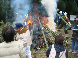 | 1月13日(日)、上川東部会館西の河原でめだかの学校『どんど焼き』がありました。 どんど焼きは、お正月に飾ったしめ縄、門松、かきぞめやお札などを焼いて、 その火で焼いた繭玉を食べて、無病息災、豊作を願います。 お正月に迎えた神様が、この火と煙に送られて天にもどると考えられているそうです。 この日上川小学校の子ども達がいっしょにやった上川東部会館西のどんど焼きは、 地元の秋山さんを中心に昔から行われている行事で、その姿も本格的です。 秋川街道に沿った河原なので、その飾りはとても目立ちます。 子ども達は、それぞれが家から持ち寄ったお正月飾りやかきぞめを一緒に焼き、 PTAの役員さんが前日作った繭玉を焼いていただきました。 ここの繭玉はあんこ入り。繭玉と言っても大きい。 本来はそれぞれの家が繭玉を持参して焼いて食べるそうで、地元の人たちは皆マイ繭玉を持ってきていました。 PTAの役員さんが作ったヤナギはまた本格的。持って帰って魔よけにするそうです。 昔からの行事には昔からの知恵がいっぱい。 現代人の子ども達がこんな知恵をいっぱいもらったら怖いものなしだよ。 時折起こる大きな音や火の熱さに驚きながら火をみつめ繭玉を焼いていた子ども達。 今年一年良い年になりますように。 |