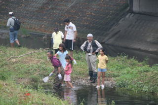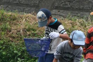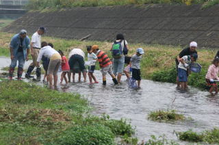9月12日(土)、川口小学校めだかの学校『川遊びをしよう!』がありました。 この日は朝から曇り空。だけど大人こども合わせて87人が集まってくれました。 みんなの気持ちが通じたのか、一日雨も降らず寒くもならず、ちょうどいい∴齠となりました。 指導をしてくださったのは、環境市民会議のみなさん。 川口川に数日前からしかけをしてくださり、魚や虫の捕り方なども教えていただきました。 捕まえた虫や魚を調べて、きれいな川に住んでいる生き物か、汚い川に住んでいる生き物か調べ、 川口川はきれいな川、ということがわかりました。 みんなで水質調査をし、そこでも川口川はきれいな川だということがわかったあとで、 お昼に食べたカレーのお皿を洗った水で水質調査をし、汚い水になっていることを確かめました。 小さい子から高学年まで、みんながこの川調べに真剣に取り組んでいる様子が、とってもよかったよ! おかあさんたちが作ったカレーはとってもおいしくて、さすがアウトドア料理No.1、カレーのチカラはさすが!! 朝早くから本当にありがとうございました。 |