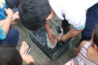 ![]() あっ、ザリガニ。手づかみなんだ。 |