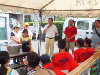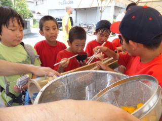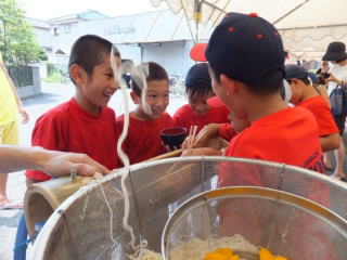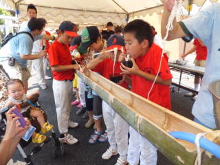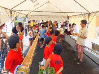 8月10日(土)松枝学区でめだかの学校「そうめん流し」がありました。 事前準備は子供部で行いました。 当日準備は町会・子供部・松枝小PTAの父母の皆さんで8時半から行いました。 PTAの皆さんには10名前後お手伝い頂きました。 参加者は人数把握の為、名前を記入して頂きましたが、89名の記名がありました。 記名無しと準備の方々を合わせますと、110名前後の参加と思われます。 例年60名前後の参加でしたので、青少対効果は大きいです。 10mの竹にそうめん、みかんや桃も流れ、多くの子供達に楽しんで頂けたと思います。 PTA母の皆さんには厨房でそうめんを茹でて頂いたり、天ぷらを揚げて頂きましたが、 とても暑かったと思います。 これに懲りずに、来年も企画を考えたいと思います。 |
