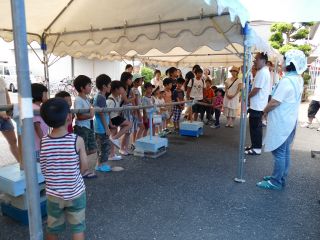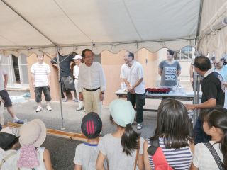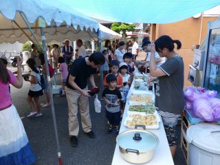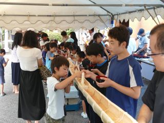 8月13日(土)松枝小学区でめだかの学校「そうめん流し大会」がありました。 子どもたちの夏休みも折り返し地点となったこの日、 会場の唐松センターは薄曇りの すごしやすい天気に恵まれました。 予定の時間よりも早くから子どもたちが集まって来ました。 町会の広報車で町内への呼びかけに協力してくれたお友だちもいました。 11時よりご挨拶のあと、いよいよそうめん流し大会の始まりです。 水が流れ、そうめんが流れて来るのを待ち構えます。 右利き・左利きで、どっちに立てば良いか、考えます。 勢いよく流れてくるそうめん。 うまくすくえるかな? 無事ゲットし、笑顔でいただきます! みんなで食べると、とてもおいしいです。 昨年も来てくれたお友だちの背が伸びて、そうめんを流すおにいさんに より近づけて、早くゲットできる姿に成長を感じます。 フルーツの他に今回は、ミニトマトが流れてきました。 ころころ流れる姿に、「はし」は難しいかな? 朝摘みのトマトは新鮮で風味たっぷりです。 松枝小PTAの皆さんも唐松町会の皆さんと共に、朝早くから準備をして頂きました。 楽しいそうめん流し大会でした。 今回の出席は、こども 62名、おとな 55名 の 合計117名でした。 ご協力、ありがとうございました。 |