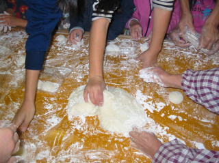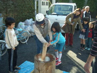 ![]() 鏡餅づくり。つきたてのお持ちに手が伸びる。 |