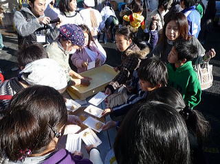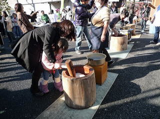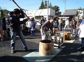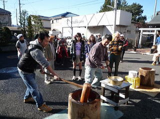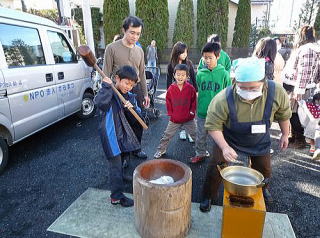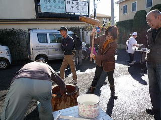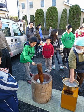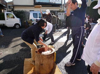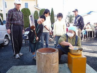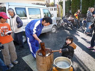 12月23日(木曜日:天皇誕生日)、唐松センターで年末恒例のもちつき大会が 唐松町会子ども部、青少対、そして松枝小PTAの共催で開かれました。 この日はもちつき日和の快晴。 この季節にしては暖かい一日でした。 もち米は30kg. 蒸しあがるとすぐに臼の前には長い列。 みんなつく気満々。 ひとり10回、振り上げた杵は意外と重かったよね? すぐに息が上がって、体がぽかぽかしたね。 先生方もたくさん参加していただきました。 もちつき体験、いかがでしたか? でもさすが、つき手と返し手、息がぴったりでしたね。 子どもたちの手前、緊張しちゃいましたね。 地域のみなさん、PTAのおかあさん方のおかげで、今年も無事餅つきを終えることができました。 ありがとうございました。 来年もいい年でありますように。 |