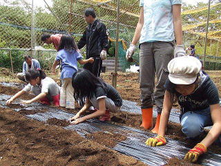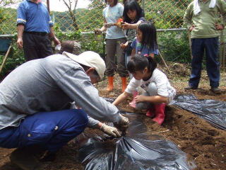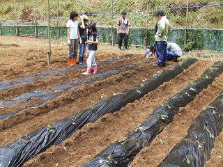 | 6月13日(日)、美山小学校でめだかの学校『苗の植え付け』がありました。 当日は曇ってはいたものの、気温は結構高かった。 朝8時半から美山小学校裏山の畑で、苗の植え付けと草狩りを行いました。 参加者は、児童30名、保護者32名、先生7名、そして地域の方が5名で 計74名の方々の参加をいただきました。 せっかくの日曜日、暑い中ご参加いただきまして、ありがとうございました。 まずは、心より御礼を申し上げます。 畑の周囲の草狩りが大変で、汗がポタポタと落ちる姿の男性陣。 畑の中では、一生懸命草をむしる子供達。時々、手より口ばかり動く子もチラホラ・・・ 耕耘機で土を耕し、肥料を与え、苗達が元気に育つ土作り。 野菜も子供も、育つ環境が大事です。 今年は、里芋、カボチャ、さつまいもを植えました。 去年は猿害により、あまり収穫できなくて悔しかったね。 今年は畑の周りに新しいネットを張ってもらったから大丈夫だよ、きっと。 元気に大きく育って、みんなでおいしく食べようね。 収穫祭が楽しみだね。 収穫祭は秋に予定しています。 生育の状態を見ながら、日時を決めますので、 心待ちにしていてください。 |