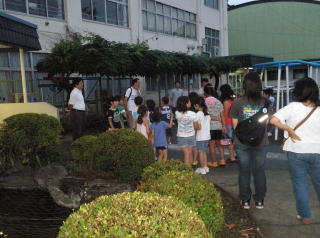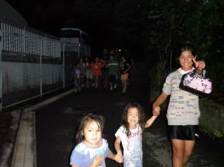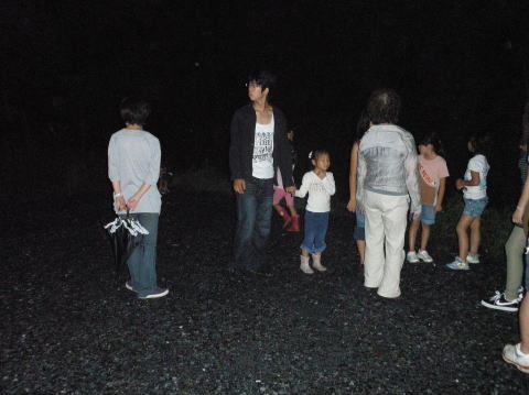 夕方、激しい夕立があり、心配しましたが、 集合時間には雨は上がりました。 子供26人、大人32人の参加がありました。 外は午後7時半になっても少し明るく、 ホタルが飛び立つにはもう少し待たなければなりません。 ようやく1匹のホタルが飛んだのが午後8時を回った頃。 かなり強い光を放ちながら、 沢沿いを我々に見てもらいたいかのように、ちゃんと往復してくれました。 初めてホタルを見た子供は「わ〜光ってる!!」と歓声を上げていました。 結局、5,6匹のホタルを確認しました。 少し物足りない感じはありますが、 これを機会に、もっと多くのホタルが生息できる環境を作ることに興味をもってもらい、 自然の大切さを学ぶことも、この「ホタル観賞」には意味があったように思います。 毎年、現れるホタルの数が増えていくようになるといいですね。 |