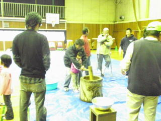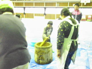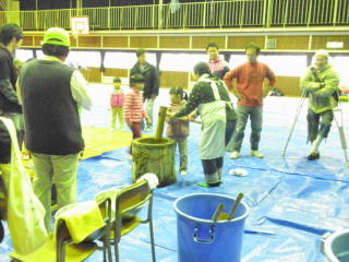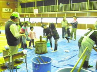 あいにく底冷えするような、どしゃ降りの雨でした。それでも参加者は、 子ども、大人合わせて、110名ほどになりました。 急遽、もちつきは体育館で行うことにし、 薪をくべての釜戸での餅米炊きは中止になりました。 女の子達は、前日から豚汁の材料を切る手伝いをしてくれました。 男の子達は、当日は校舎一番奥の家庭科室、図工室で作業するお母さん達のところへ できあがった餅や研いだ餅米を運んでくれました。 そして、みんなで突いたお餅と温かい豚汁を食べました。 寒い体育館で食べると、お腹の中からほんのり暖まる感じがします。 お餅は、きなこ、あんこ、磯辺、大根おろし、みたらしの5種類で、 どれも美味しかったね。豚汁は、たくさんの人達がおかわりをしていました。 終わる頃には、太陽が顔をのぞかせていました。 |