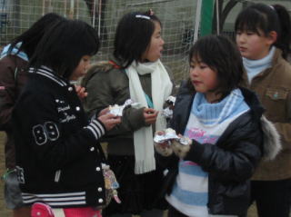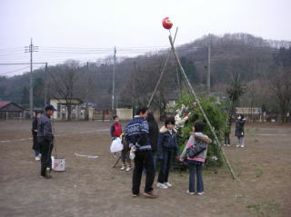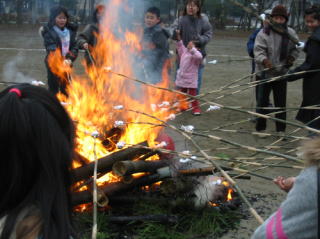 | 2008年が始まりました。 正月の恒例行事どんど焼きが、1月12日(土)美山小学校で行われました。 この日は朝からどんよりとした曇り空。時折霧雨も降る寒いお天気でしたが、 子ども、おとな合わせて51人が集まり、無事行われました。 PTAの役員さんと地域の方々は、朝8時40分に美山小学校に集合しました。 おかあさん方は上新粉を使った繭玉づくり、男性陣は裏山で竹を切り出しました。 立派な孟宗竹で井桁の形に組み、4本の柱の合わさったてっぺんにはだるまさん。 篠竹は100本あまりを切り出してきました。繭玉を先につけて準備完了です。 子ども達が家から持ってきた書き損じの書初め、松飾、締め縄などが上に置かれました。 点火すると一気に炎に包まれ、みんなで輪になって囲んで見ていました。 火の勢いが収まったら繭玉の登場です。 みんな1本ずつ持って火にかざして焼きました。 竹が燃えてたき火の中に繭玉を落としちゃった子も(大人も)いましたよね。 校長先生も副校長先生も一緒に焼きました。 みんなで一緒に校庭の真ん中で火を見ていると、心の中がすがすがしくなった気がしたよ。 今年一年、みんなにいいことがありますように。 みんな健康で元気でありますように。 |