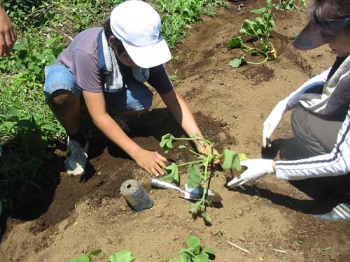 | 6月16日(土)、美山小学校の美山農園で、苗の植えつけをしました。 昨日梅雨入りしたばかりなのに朝から暑い一日となりましたが、 子ども、大人合わせて34人が集まってくれました。 植え付けをする苗は、とうもろこしとかぼちゃです。 とうもろこしは、もう50cmぐらいまで成長した苗と、 種から育ててやっと10cmぐらいになったばかりのちいさい苗が用意されていました。 かぼちゃの苗にはもう花が咲いていて、これからぐんぐん育ちそう。 畑はもう近くのおじさん方により手入れがされていて、畝もつくられ、あとは植えるだけになっていました。 子どももお母さん方も、校長先生も一緒になって植えつけに汗を流しました。 夏には収穫。それまで草刈りや水遣りの世話もしないとね。 おいしいとうもろこしとかぼちゃがたくさんできるといいね。楽しみ!! |