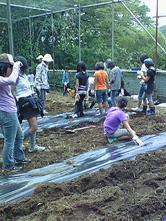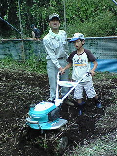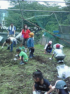 6月14日(日)、美山小学校の美山農園で、苗の植えつけをしました。 この日は朝から真夏のように暑い暑い。 それでも、子ども36人、大人58人、合わせて94人も集まってくれました。 その中には先生も7人。ありがとうございました。 植え付けをする苗は、かぼちゃとさといも、それからスイカ!! 昨年までは、大人が用意してくれた畑に苗を植えるだけだったけど、 今年はすごいよ! 草刈りをし、畑を耕し、そして植え付けまで全部やった。、 いつもはさわらせてももらえない耕運機も教えてもらって自分たちでやった。 大人もこどももいっしょになって汗を流して畑仕事。 これがなんて清清しい。。 去年は植えた作物ほぼ全滅、がっかりだったんだよね? 今年もいっぱい収穫できるといいね。 スイカがでっかくなるといいね!! みんなが気持ちを込めてつくったはたけだもん、きっと甘いおいしい野菜になるよ!!! 今年こそはきっとね! |