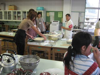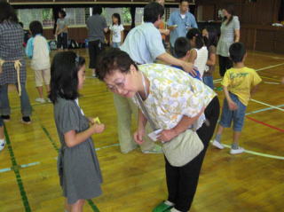 | 7月15日(日)、品川区の鮫浜小学校と美山小学校の交流会がありました。 鮫浜小学校は品川区の東京湾の近くの小学校で、 戦時中に美山小に疎開したのがきっかけで美山小との交流が始まりました。 鮫浜小学校の子どもたちやお父さん、お母さんはもちろん、 戦争当時の小学生、今はおじいちゃん・おばあちゃんたちも 3台のバスに乗って美山の町に一緒に来てくれました。 当日は台風で雨が強くあいにくのお天気でしたが、 おじいちゃん、おばあちゃんたちは小型のバスで懐かしい美山の町を見て歩き、 小学生たちは体育館で交流会をしました。 体育館では名刺交換ゲームや竹細工、ドッヂボールをしました。 竹は、美山小自慢の裏の竹林からその日の朝切ってきたものです。 はじめに両校の校長先生のお話を聞いたあと、 美山小の代表の6年生が「みんなが来てくれてありがとう」と 鮫浜小の代表の6年生が「来るのをとても楽しみにしていました」と話をしました。 大型バス2台と小型バス1台で鮫浜小学校から64人、 迎える美山小は94人 台風なんかどこへやらの熱気あふれる体育館でした。 帰るころには小雨。 みんなで握手をして鮫浜小学校からお茶をいただいてお別れしました。 またきっとお会いしましょうね!! |